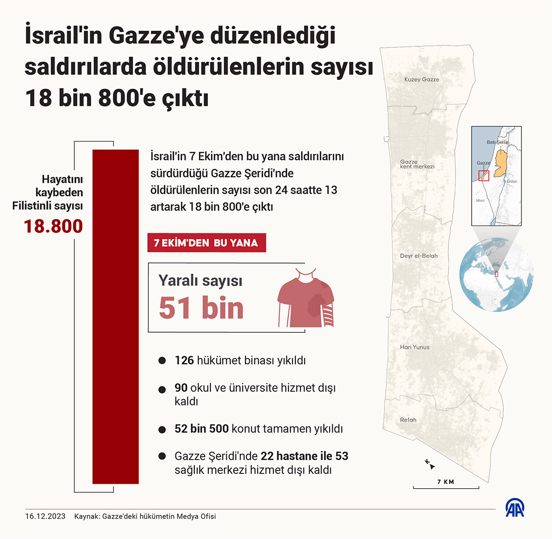 İsrail'in 7 Ekim'den bu yana saldırılarını sürdürdüğü Gazze Şeridi'nde öldürülenlerin sayısı son 24 saatte 13 artarak 18 bin 800'e çıktı. (Grafik: Kemal Delikmen/AA)