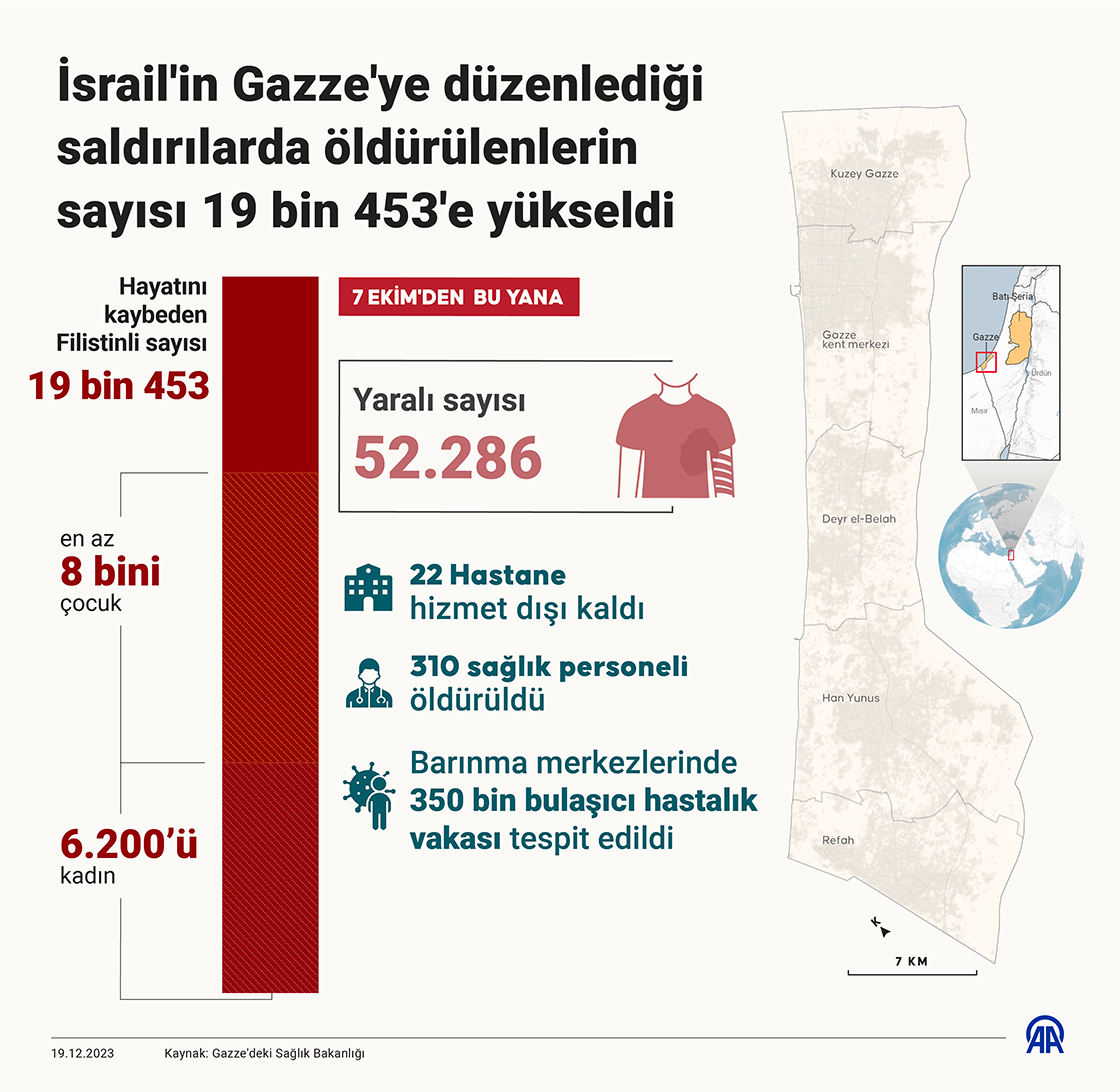 İsrail'in Gazze'ye düzenlediği saldırılarda öldürülenlerin sayısı 19 bin 453'e yükseldi