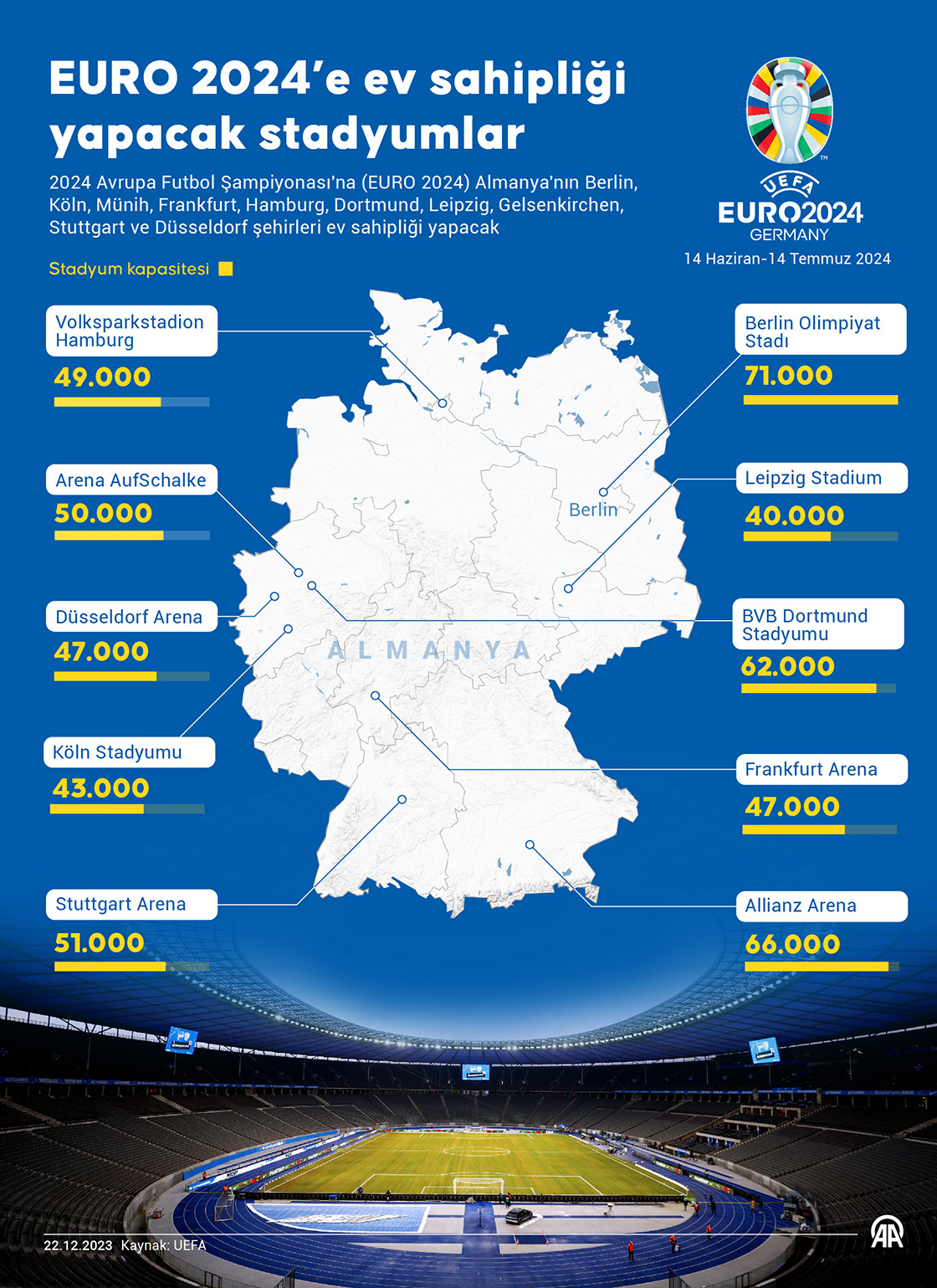 2024 Avrupa Şampiyonası'na (EURO 2024) Almanya'nın Berlin, Köln, Münih, Frankfurt, Hamburg, Dortmund, Leipzig, Gelsenkirchen, Stuttgart ve Düsseldorf şehirleri ev sahipliği yapacak. (Grafik: Mahmut Resul Karaca/AA)