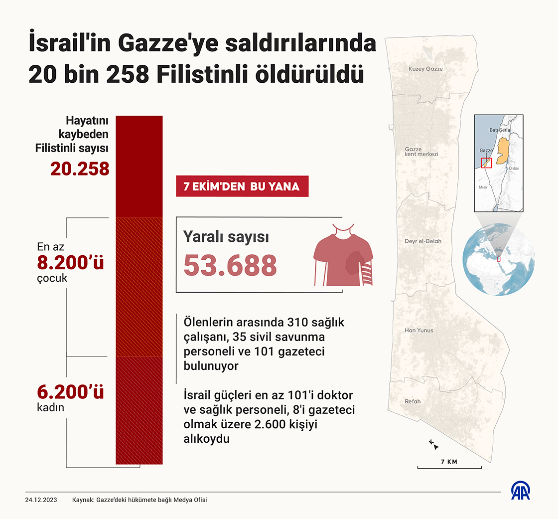 Ölenlerin arasında 310 sağlık çalışanı, 35 sivil savunma personeli ve 100 gazeteci bulunuyor.İsrail güçleri en az 101'i doktor ve sağlık personeli, 8'i gazeteci olmak üzere 2.600 kişiyi alıkoydu. (Grafik: Elmurod Usubaliev/AA)24 Aralık 2023•Güncelleme: 24 Aralık 2023