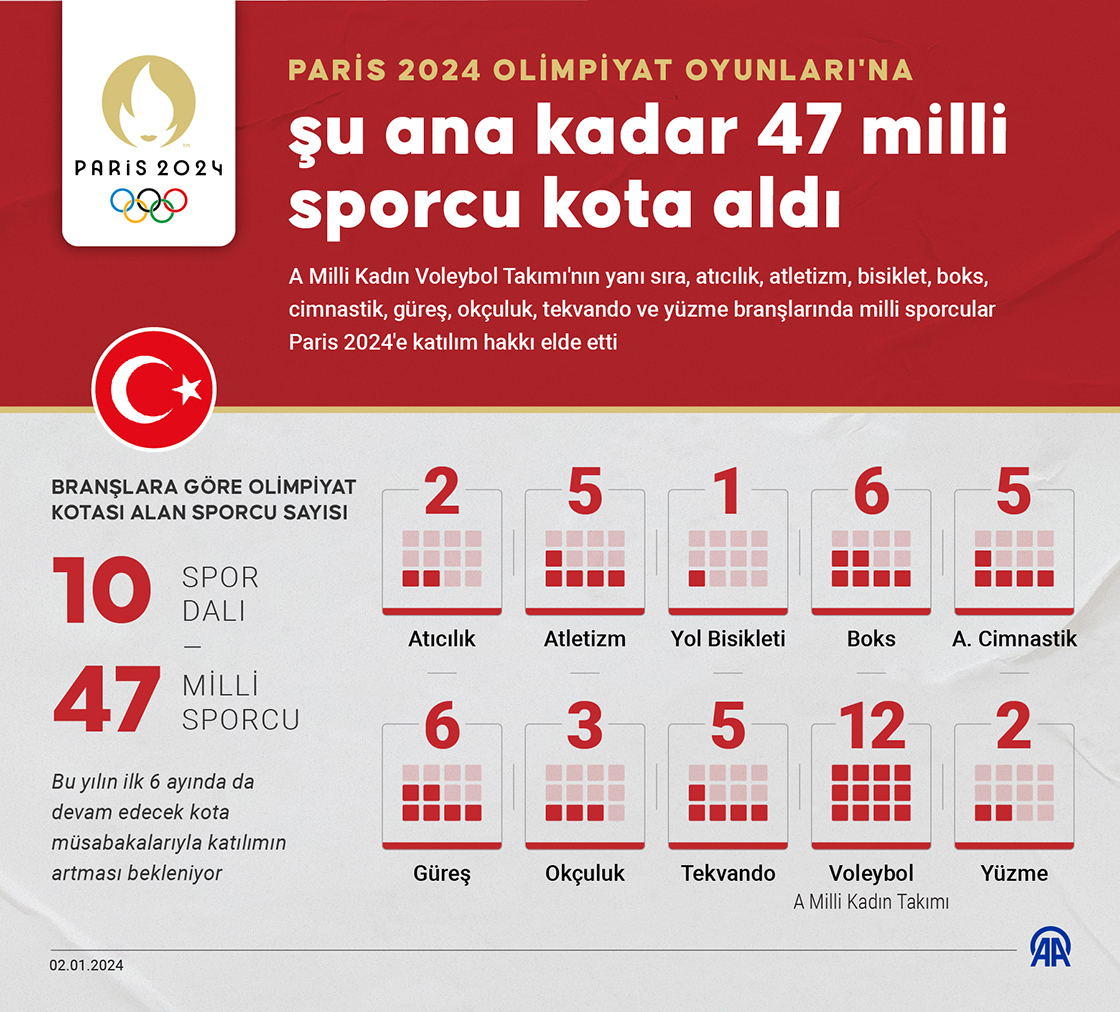 A Milli Kadın Voleybol Takımı'nın yanı sıra, atıcılık, atletizm, bisiklet, boks, cimnastik, güreş, okçuluk, tekvando ve yüzme branşlarında milli sporcular 2024 Paris'e katılım hakkı elde etti. (Grafik: Muhammed Ali Yiğit/AA)02 Ocak 2024•Güncelleme: 02 Ocak 2024