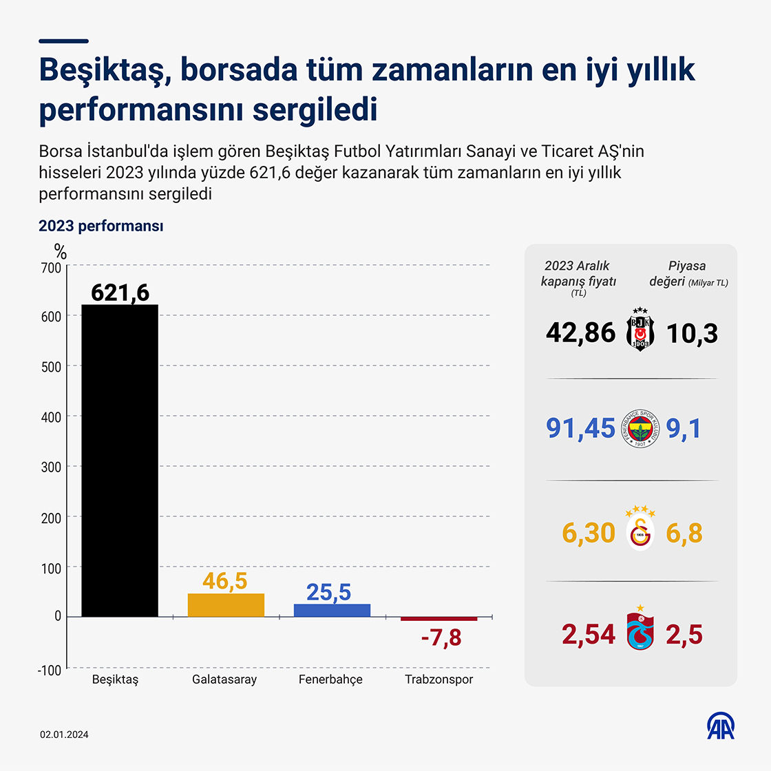 Borsa İstanbul'da işlem gören Beşiktaş Futbol Yatırımları Sanayi ve Ticaret AŞ'nin hisseleri 2023 yılında yüzde 621,6 değer kazanarak tüm zamanların en iyi yıllık performansını sergiledi. (Grafik: Omar Zaghloul/AA)