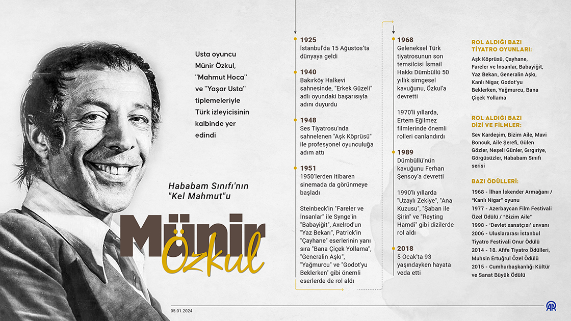 Adile Naşit ile başrolü paylaştığı aile filmlerinin yanı sıra Hababam Sınıfı'ndaki 'Kel Mahmut' tiplemesiyle de hafızalara kazınan usta oyuncu, 1998'de Kültür ve Turizm Bakanlığı 'devlet sanatçısı' unvanını, 2015'te ise Cumhurbaşkanlığı Kültür ve Sanat Büyük Ödülü'nü aldı. (Grafik: Kemal Delikmen/AA)05 Ocak 2024•Güncelleme: 05 Ocak 2024