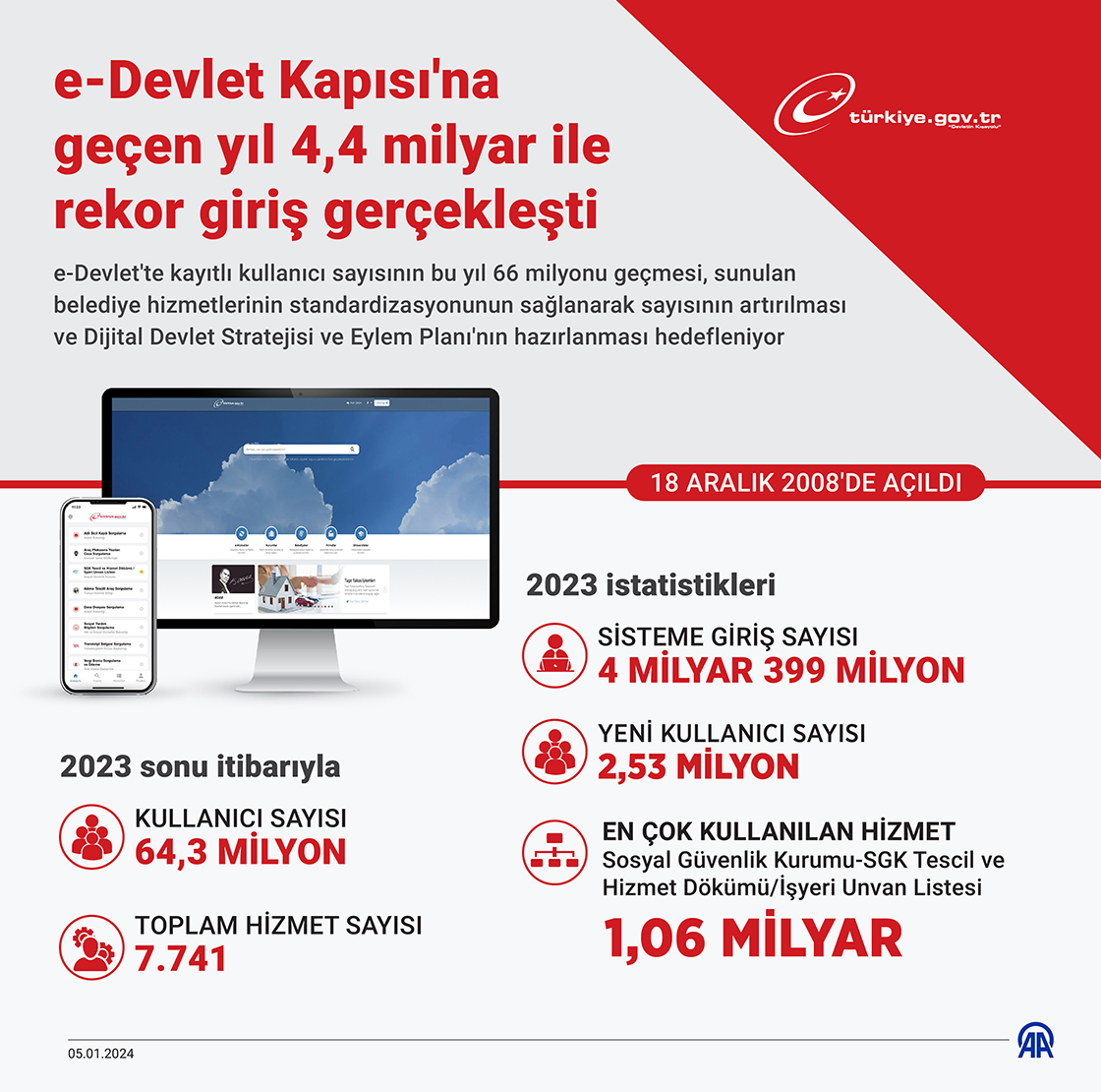 e-Devlet'te kayıtlı kullanıcı sayısının bu yıl 66 milyonu geçmesi, sunulan belediye hizmetlerinin standardizasyonunun sağlanarak sayısının artırılması ve Dijital Devlet Stratejisi ve Eylem Planı'nın hazırlanması hedefleniyor. (Grafik: Omar Zaghloul/AA)05 Ocak 2024•Güncelleme: 05 Ocak 2024