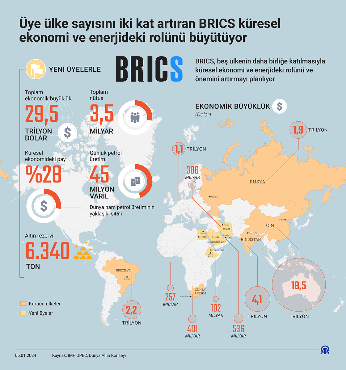 Aralarında Rusya, Çin ve Hindistan’ın da bulunduğu, önde gelen gelişmekte olan ekonomilerden oluşan BRICS, beş ülkenin daha birliğe katılmasıyla küresel ekonomi ve enerjideki rolü ve önemini artırmayı planlıyor. (Grafik: Elmurod Usubaliev/AA)05 Ocak 2024•Güncelleme: 05 Ocak 2024