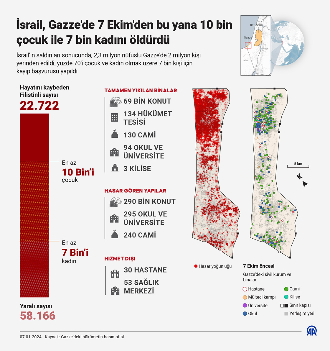 İsrail’in saldırıları sonucunda, 2,3 milyon nüfuslu Gazze’de 2 milyon kişi yerinden edildi, yüzde 70'i çocuk ve kadın olmak üzere 7 bin kişi için kayıp başvurusu yapıldı. (Grafik: Efnan İpşir/AA)