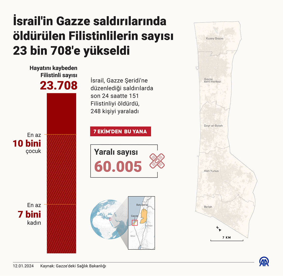 İsrail'in Gazze saldırılarında öldürülen Filistinlilerin sayısı 23 bin 708'e yükseldi