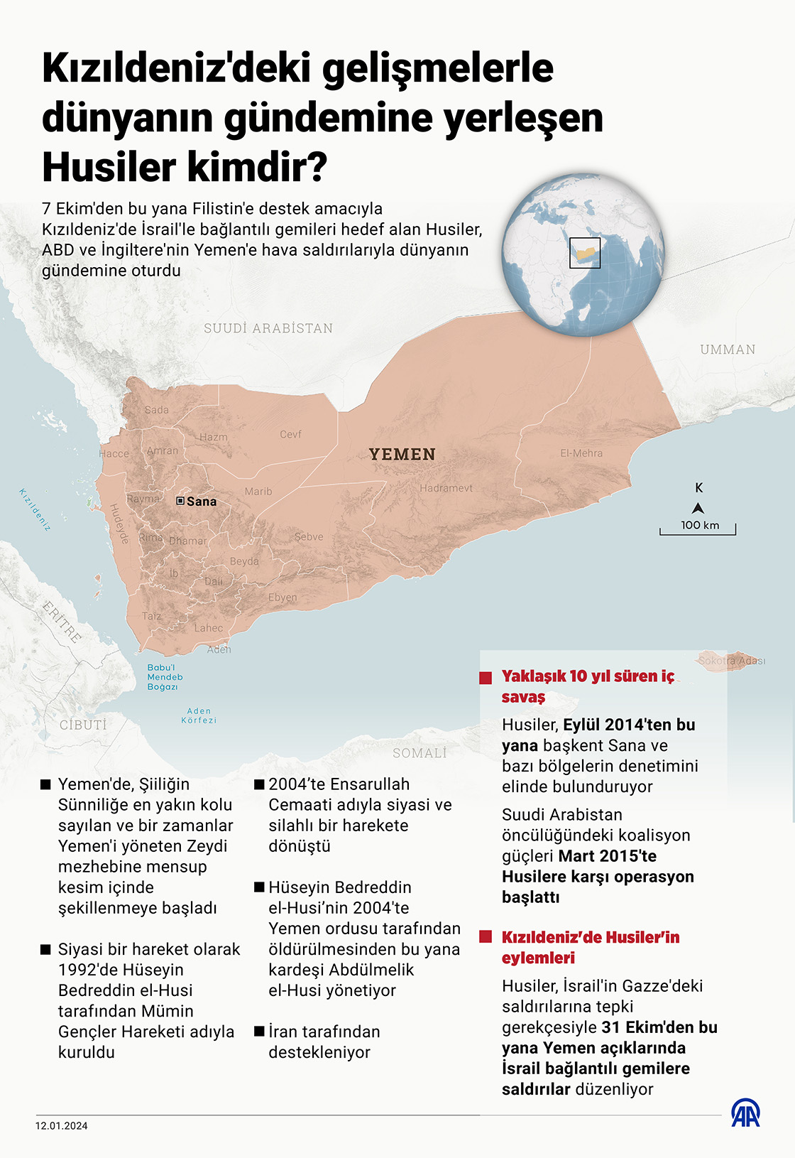 İsrail'in Gazze Şeridi'ne yönelik saldırılarının başladığı 7 Ekim'den bu yana Filistin'e destek amacıyla Kızıldeniz'de İsrail'e ait veya İsrail'e giden gemileri hedef alan Husiler, ABD ve İngiltere'nin Yemen'e hava saldırılarıyla dünyanın gündemine oturdu. (Grafik: Omar Zaghloul/AA)12 Ocak 2024•Güncelleme: 12 Ocak 2024