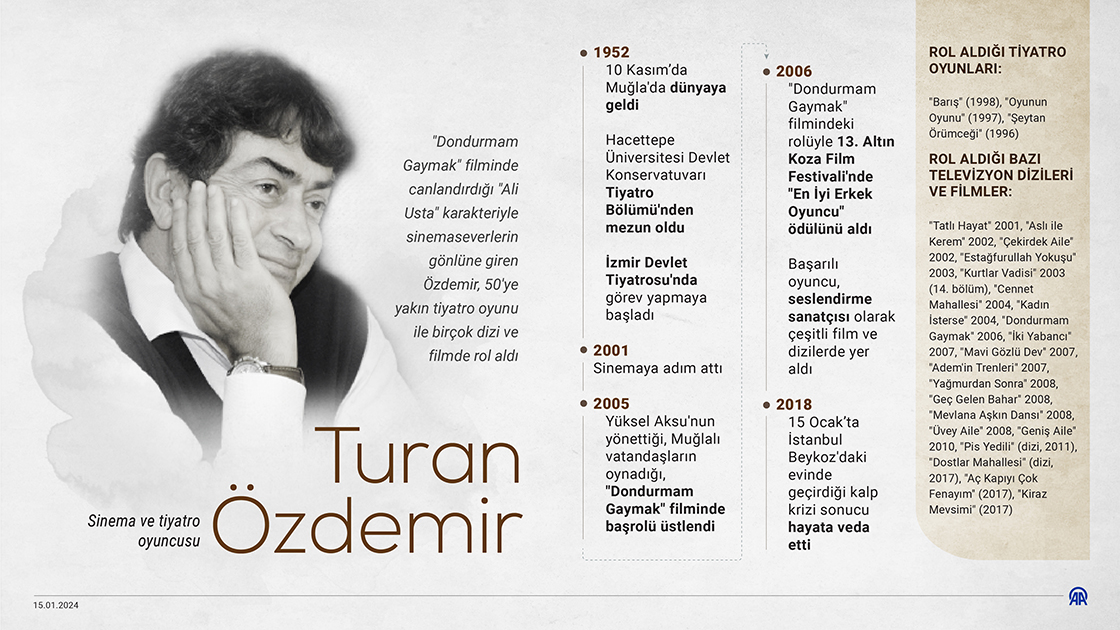 "Dondurmam Gaymak" filminde canlandırdığı "Ali Usta" karakteriyle sinemaseverlerin gönlüne giren Özdemir, 50'ye yakın tiyatro oyunu ile birçok dizi ve filmde rol aldı (Grafik: Efnan İpşir/AA)