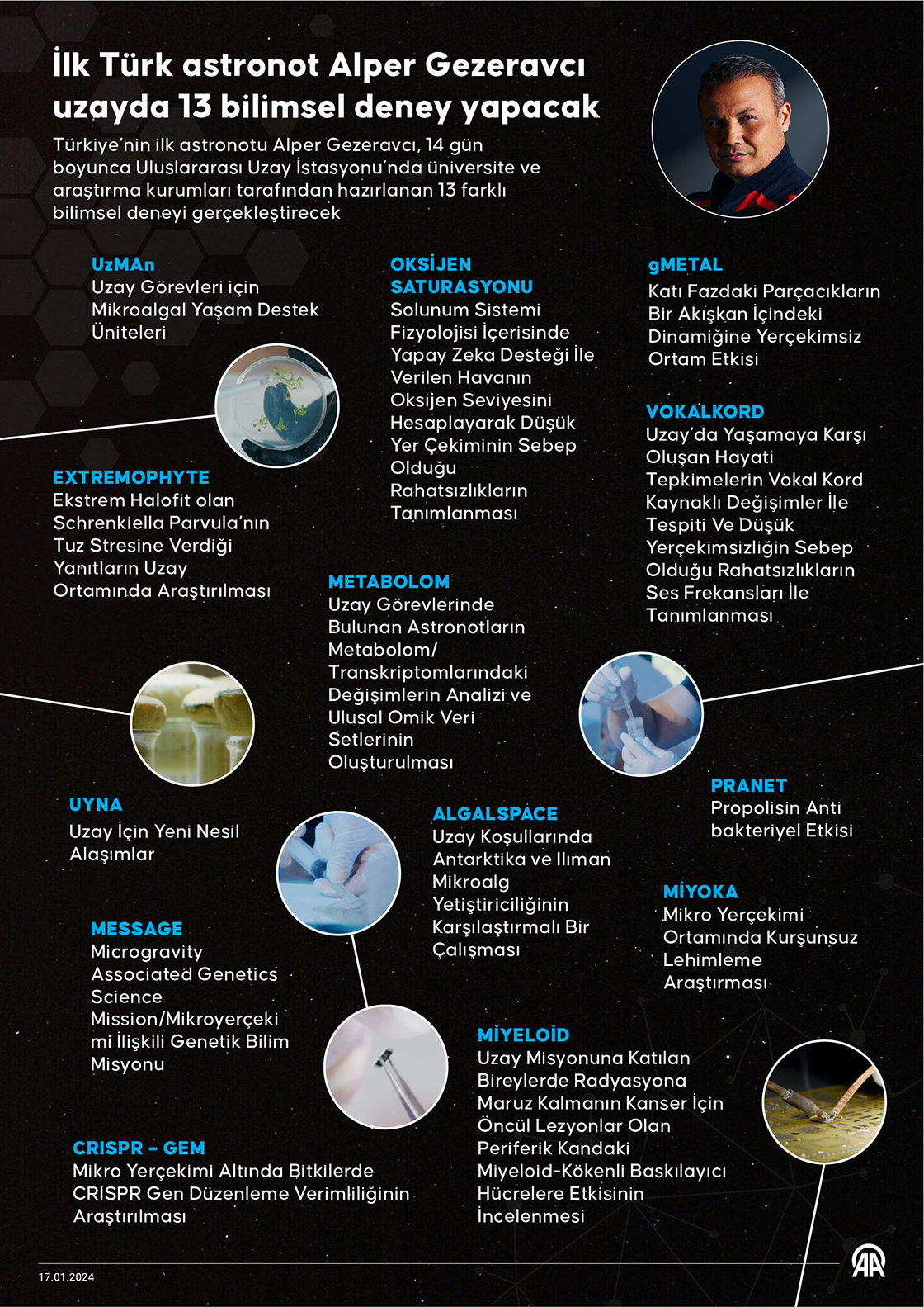 Türkiye'nin ilk astronotu Alper Gezeravcı, 14 gün boyunca Uluslararası Uzay İstasyonu'nda (ISS) üniversite ve araştırma kurumlarınca hazırlanan 13 farklı bilimsel deneyi gerçekleştirecek (Grafik: Yasin Demirci/AA)