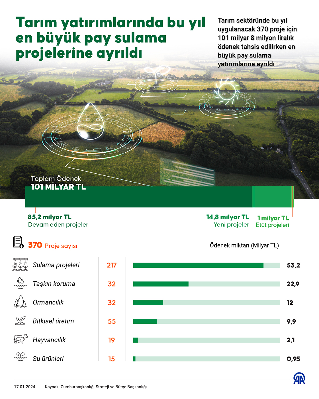 Tarım sektöründe bu yıl uygulanacak 370 proje için 101 milyar 8 milyon liralık ödenek tahsis edilirken en büyük pay sulama yatırımlarına ayrıldı (Grafik: Efnan İpşir/AA)