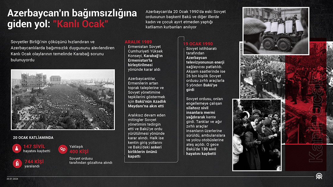Azerbaycan'da 20 Ocak 1990'da Sovyet ordusunun Bakü ve diğer illerde kadın ve çocuk ayırt etmeden gerçekleştirdiği katliamın kurbanları anılıyor. (Grafik: Omar Zaghloul/AA)