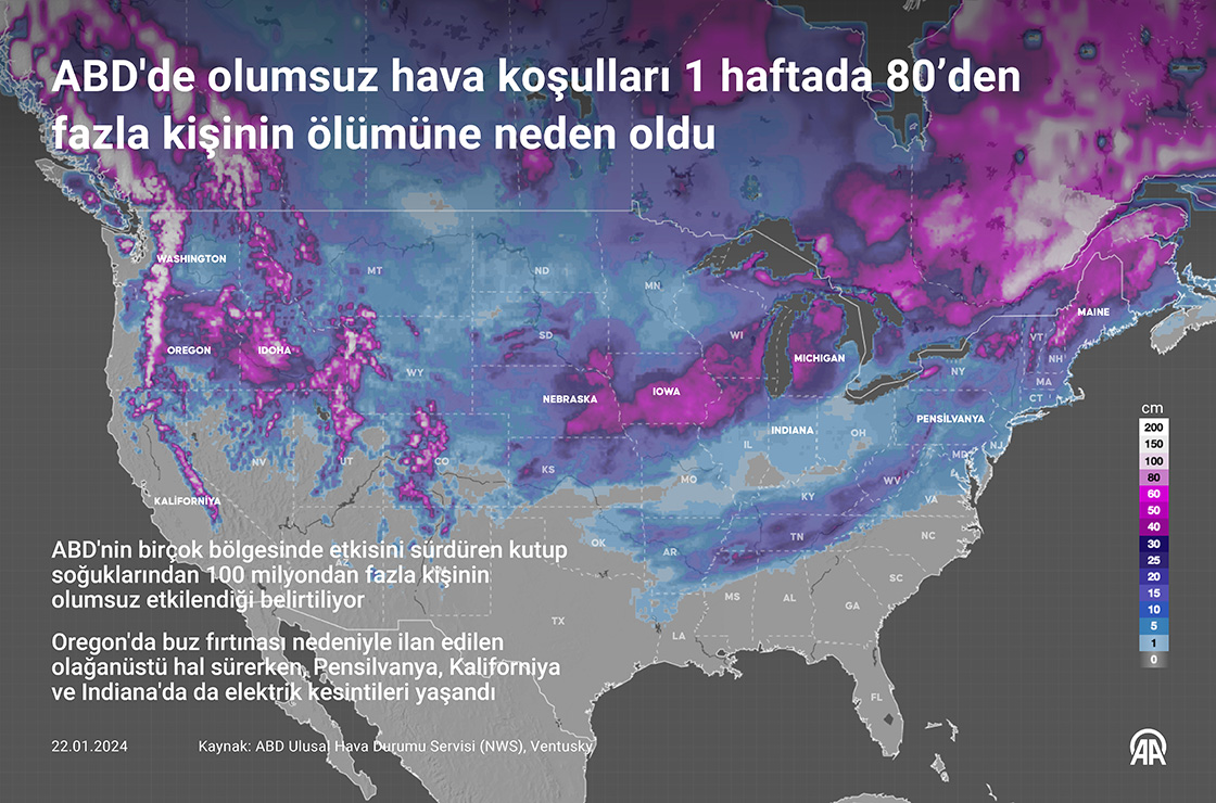 ABD'nin birçok bölgesinde son 1 haftadır yaşanan sert hava koşullarının yol açtığı olaylarda, ülke genelinde 80'den fazla kişi yaşamını yitirdi. (Grafik: Elmurod Usubaliev/AA)