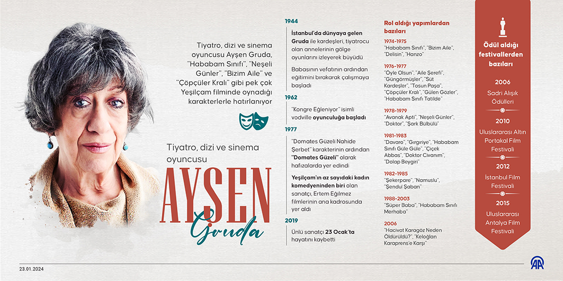 Sanatla dolu bir ömür yaşayan Yeşilçam'ın unutulmaz isimlerinden tiyatro, dizi ve sinema oyuncusu Ayşen Gruda'nın vefatının üzerinden 5 yıl geçti (Grafik: Elif Acar/AA)
