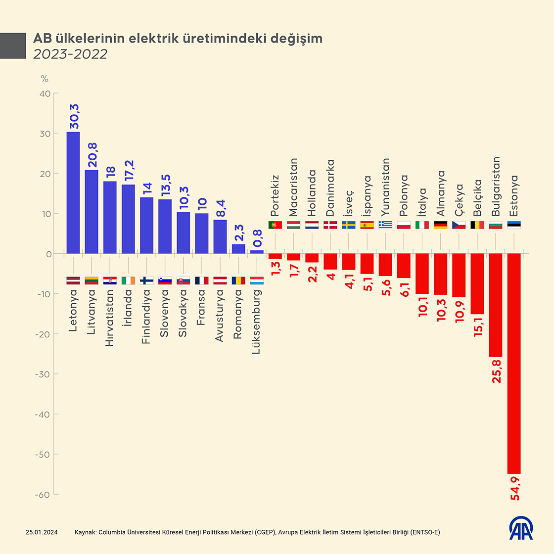 Avrupa'da geçen yıl elektrik üretiminde kömür ve doğal gazın payı, rüzgar, güneş ve nükleer gibi temiz üretim kaynaklarının katkısıyla azaldı. Bölgede sürdürülen enerji verimliliği ve tasarruf önlemlerinin de talebin azalmasına neden olduğu belirtildi. (Grafik: Yasin Demirci/AA)25 Ocak 2024•Güncelleme: 25 Ocak 2024