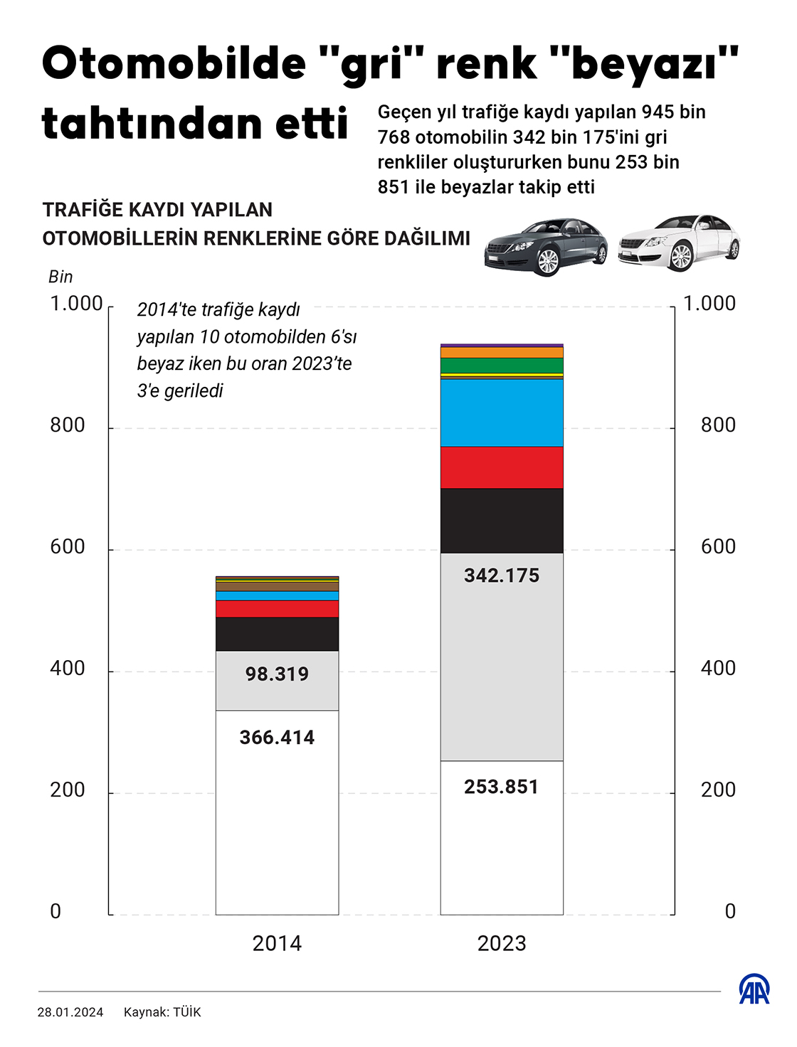 Geçen yıl trafiğe kaydı yapılan 945 bin 768 otomobilin 342 bin 175'ini gri renkliler oluştururken bunu 253 bin 851 ile beyazlar takip etti. (Grafik: Efnan İpşir/AA)