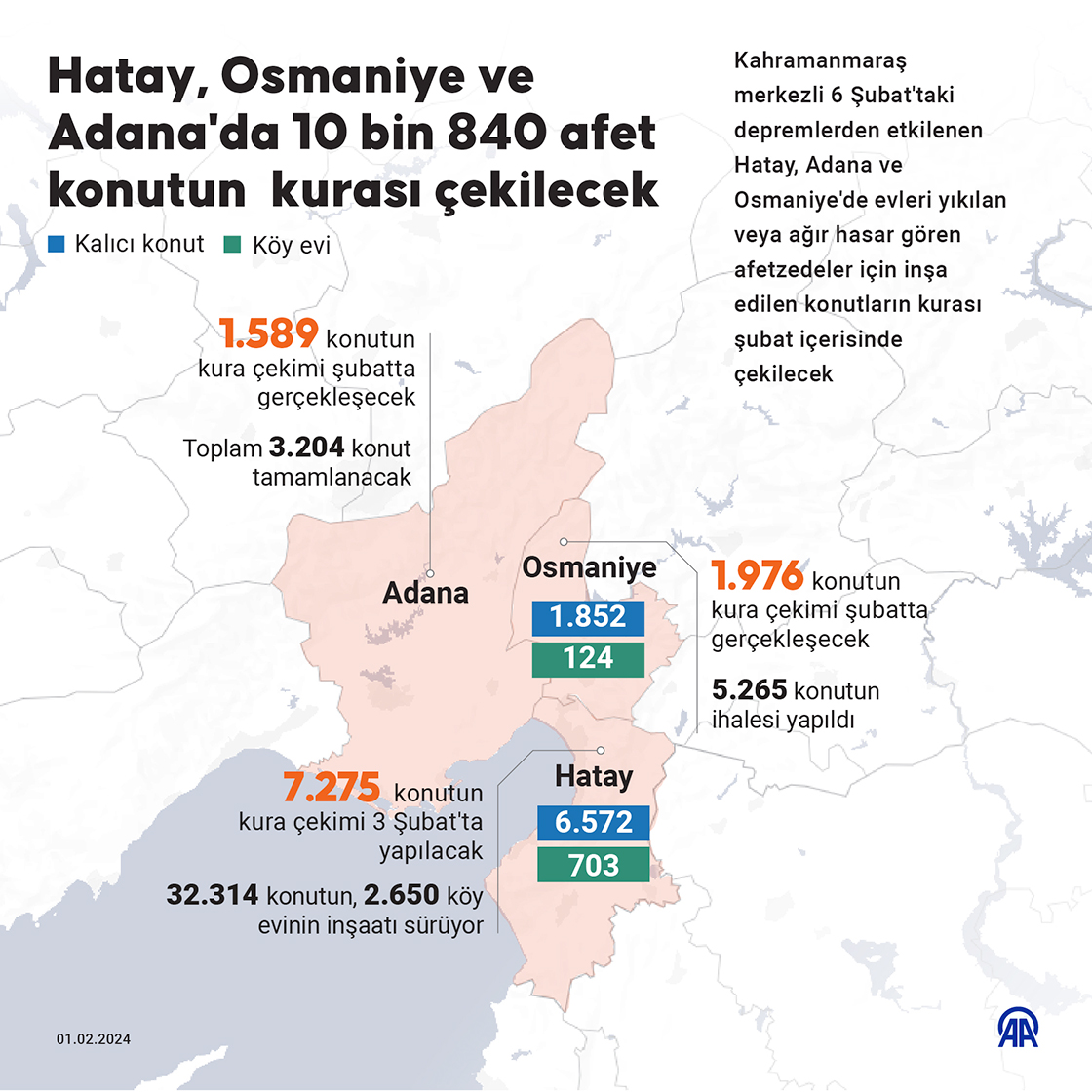 Kahramanmaraş merkezli 6 Şubat'taki depremlerden etkilenen Hatay, Adana ve Osmaniye'de evleri yıkılan veya ağır hasar gören afetzedeler için inşa edilen konutların kurası şubat içerisinde çekilecek (Grafik: Efnan İpşir/AA)01 Şubat 2024•Güncelleme: 01 Şubat 2024