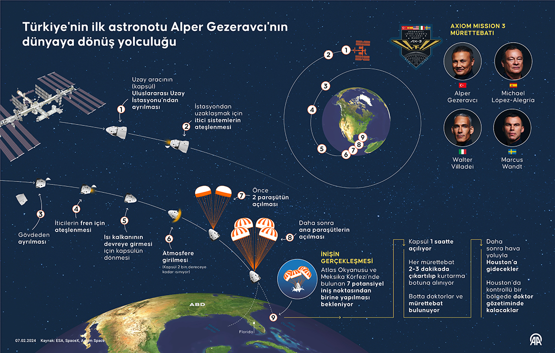Alper Gezeravcı'nın da aralarında bulunduğu Ax-3 mürettebatı Uluslararası Uzay İstasyonu'ndan (ISS) ayrılarak Dünya'ya geri dönecek. (Grafik: Yasin Demirci/AA)