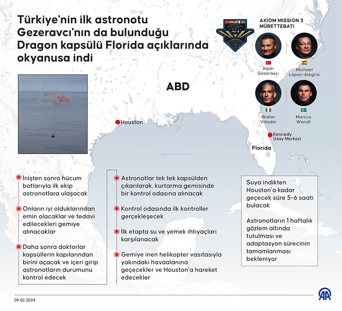 Türkiye'nin ilk astronotu Gezeravcı'nın da bulunduğu Dragon kapsülü Florida açıklarında okyanusa indi