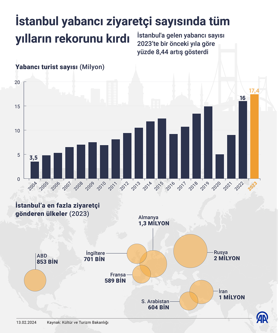 Dünyanın en çok ziyaret edilen şehirlerinin başında gelen İstanbul, 2023 yılında 17 milyon 370 bin 30 yabancı ziyaretçi ağırlayarak tüm yılların rekorunu kırdı. (Grafik: Omar Zaghloul/AA)