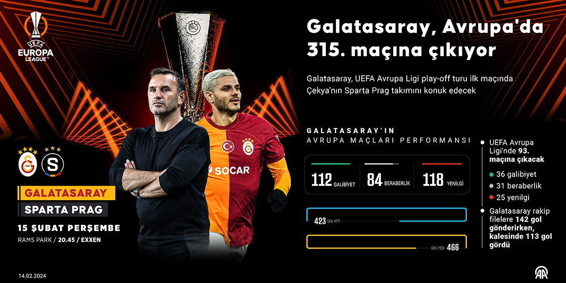UEFA Avrupa Ligi play-off turu ilk maçında Çekya'nın Sparta Prag takımını konuk edecek Galatasaray, Avrupa kupalarında 315. mücadelesine çıkacak. (Grafik: Kemal Delikmen
