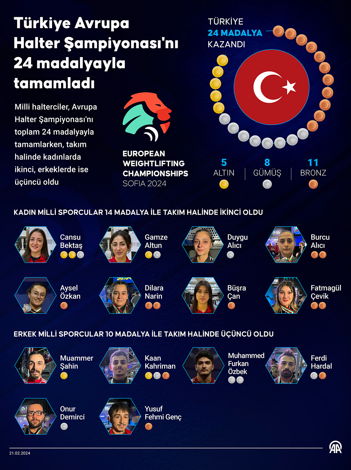 Milli halterciler, Avrupa Halter Şampiyonası'nı toplam 24 madalyayla tamamlarken, takım halinde kadınlarda ikinci, erkeklerde ise üçüncü oldu. (Grafik: Muhammed Ali Yiğit/AA)