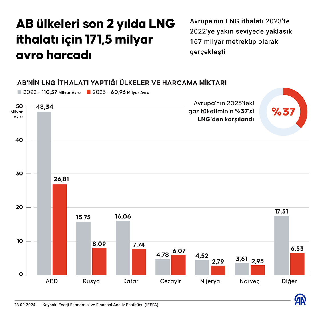 Avrupa Birliği (AB) ülkeleri, son 2 yılda sıvılaştırılmış doğal gaz (LNG) ithalatına 75,1 milyar avrosu ABD'ye olmak üzere 171,5 milyar avro ödedi. (Grafik: Muhammed Ali Yiğit/AA)