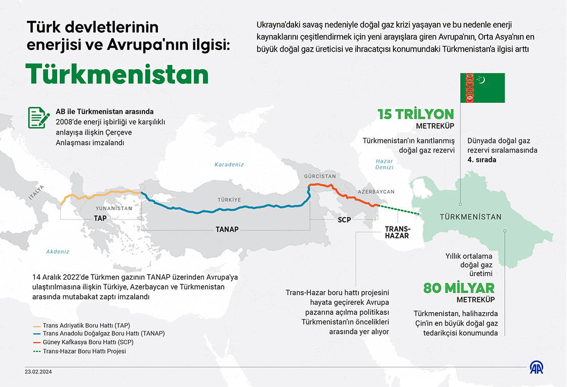 Ukrayna'daki savaş nedeniyle doğal gaz krizi yaşayan ve bu nedenle enerji kaynaklarını çeşitlendirmek için yeni arayışlara giren Avrupa'nın, Orta Asya'nın en büyük doğal gaz üreticisi ve ihracatçısı konumundaki Türkmenistan'a ilgisi arttı (Grafik: Efnan İpşir/AA)23 Şubat 2024•Güncelleme: 23 Şubat 2024