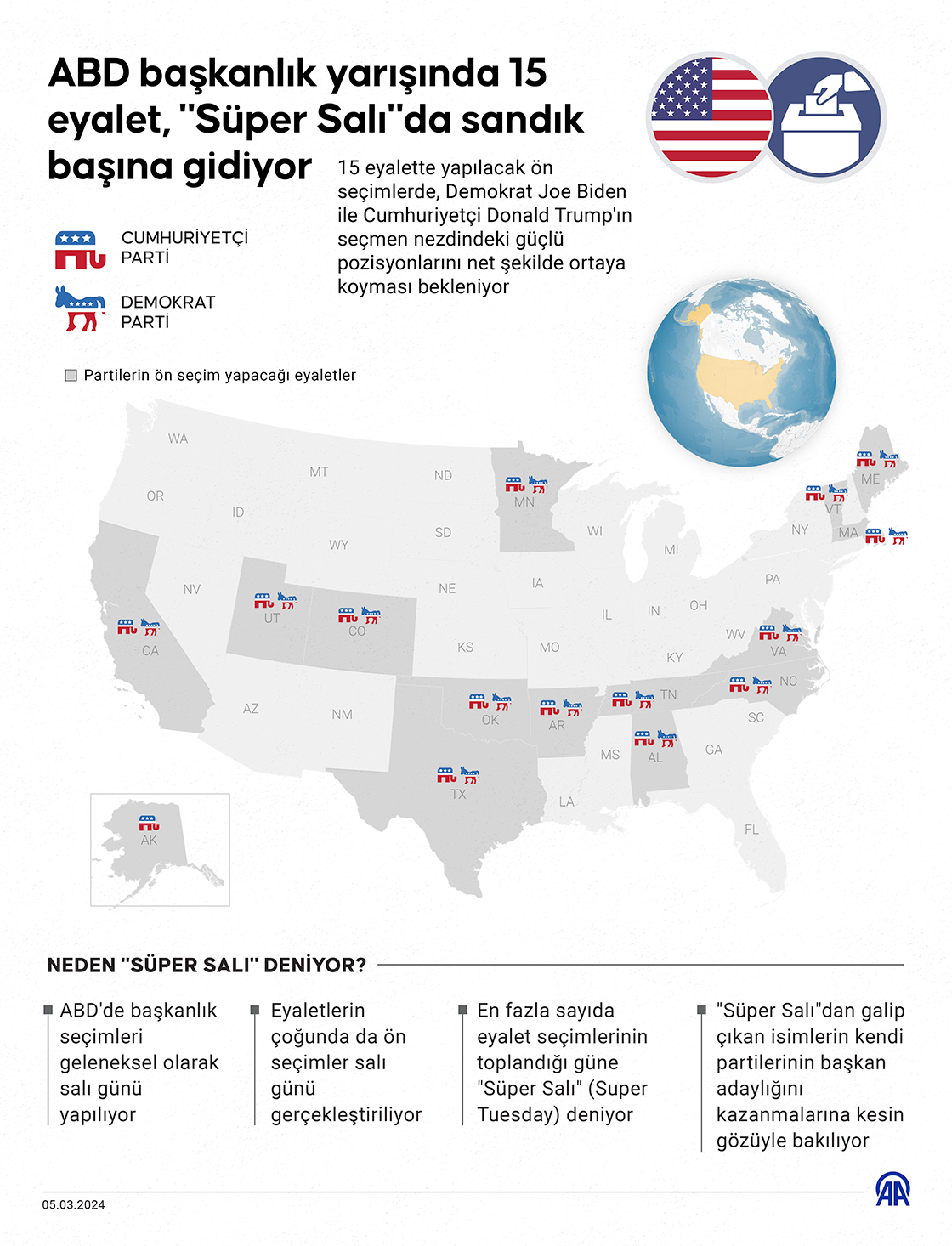 ABD başkanlık yarışında geri sayım sürerken 15 eyalette bugün yapılacak ön seçimlerde, Demokrat Joe Biden ile Cumhuriyetçi Donald Trump'ın seçmen nezdindeki güçlü pozisyonlarını net şekilde ortaya koyması bekleniyor.