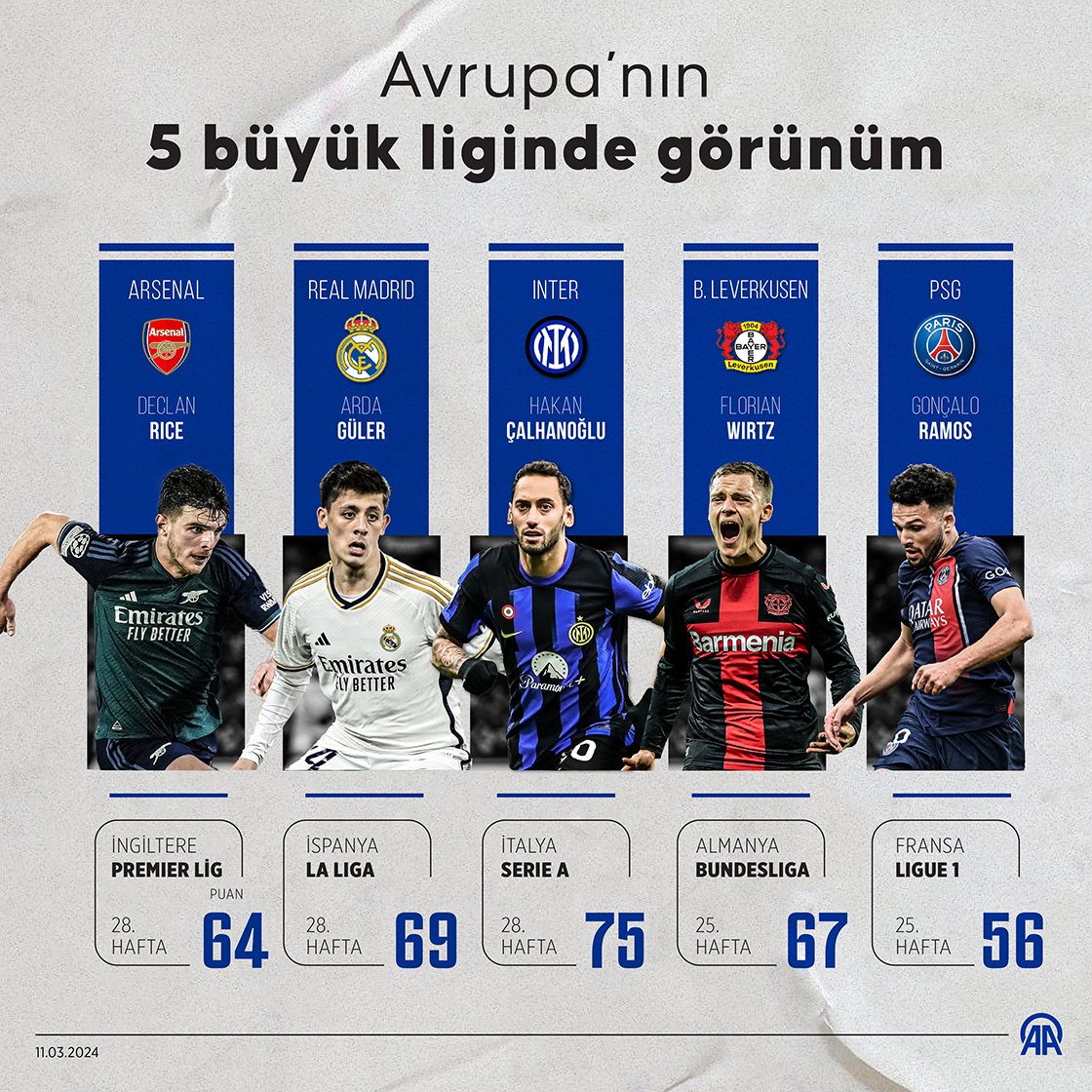 Avrupa'nın 5 büyük futbol ülkesi Almanya (Bundesliga), Fransa (Ligue 1), İngiltere (Premier Lig), İspanya (LaLiga) ve İtalya'daki (Serie A) maçlara hafta sonu devam edildi. (Grafik: Mehmet Yaren Bozğun/AA)
