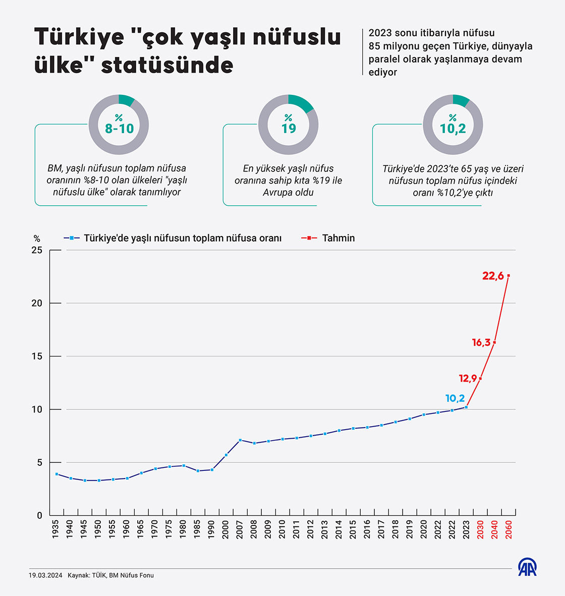 2023 sonu itibarıyla nüfusu 85 milyonu geçen Türkiye, dünyayla paralel olarak yaşlanmaya devam ediyor. (Grafik: Mehmet Yaren Bozğun/AA)