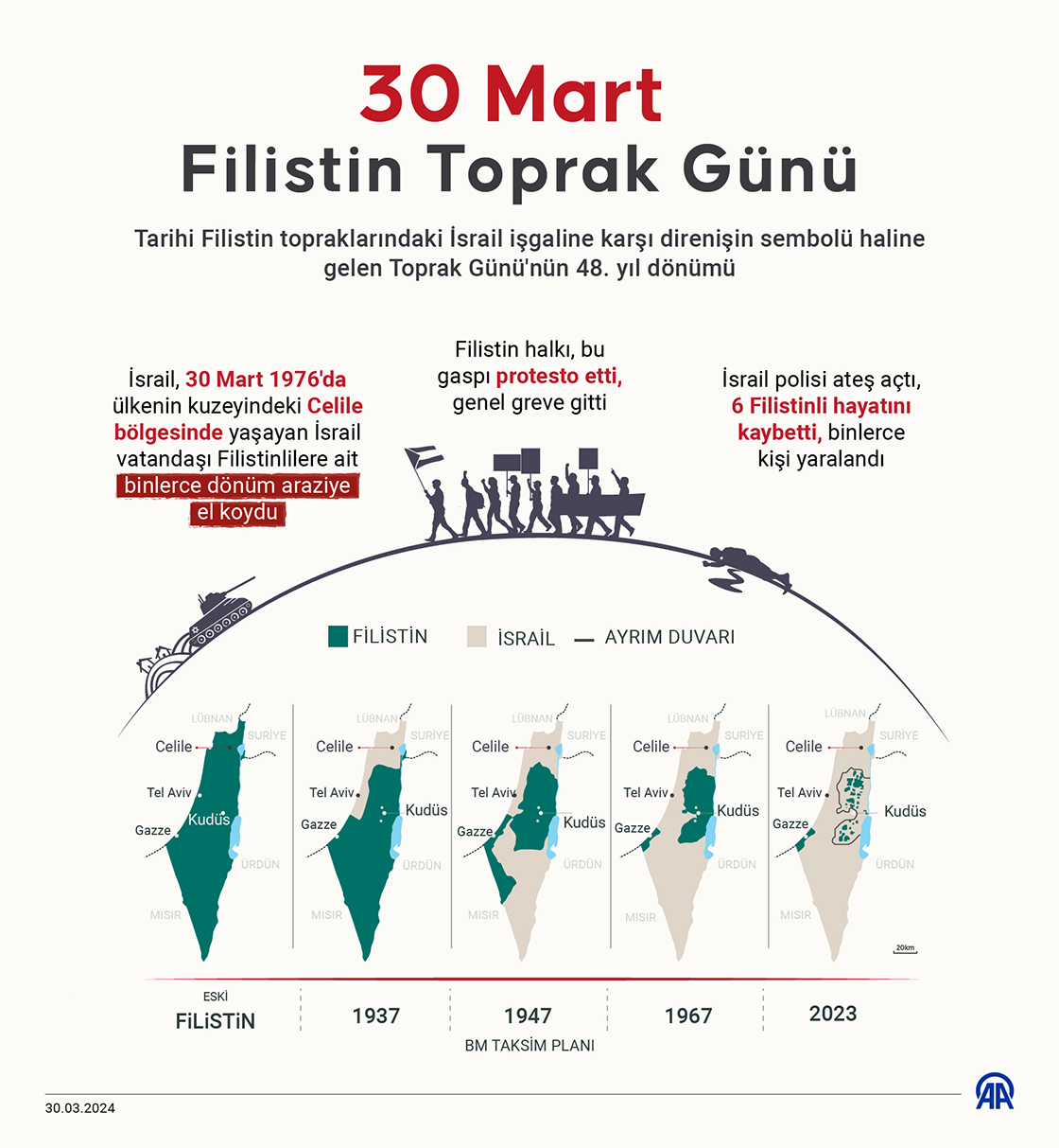 Tarihi Filistin topraklarındaki İsrail işgaline karşı direnişin sembolü haline gelen Toprak Günü'nün 48. yıl dönümü (Grafik: Efnan İpşir/AA)