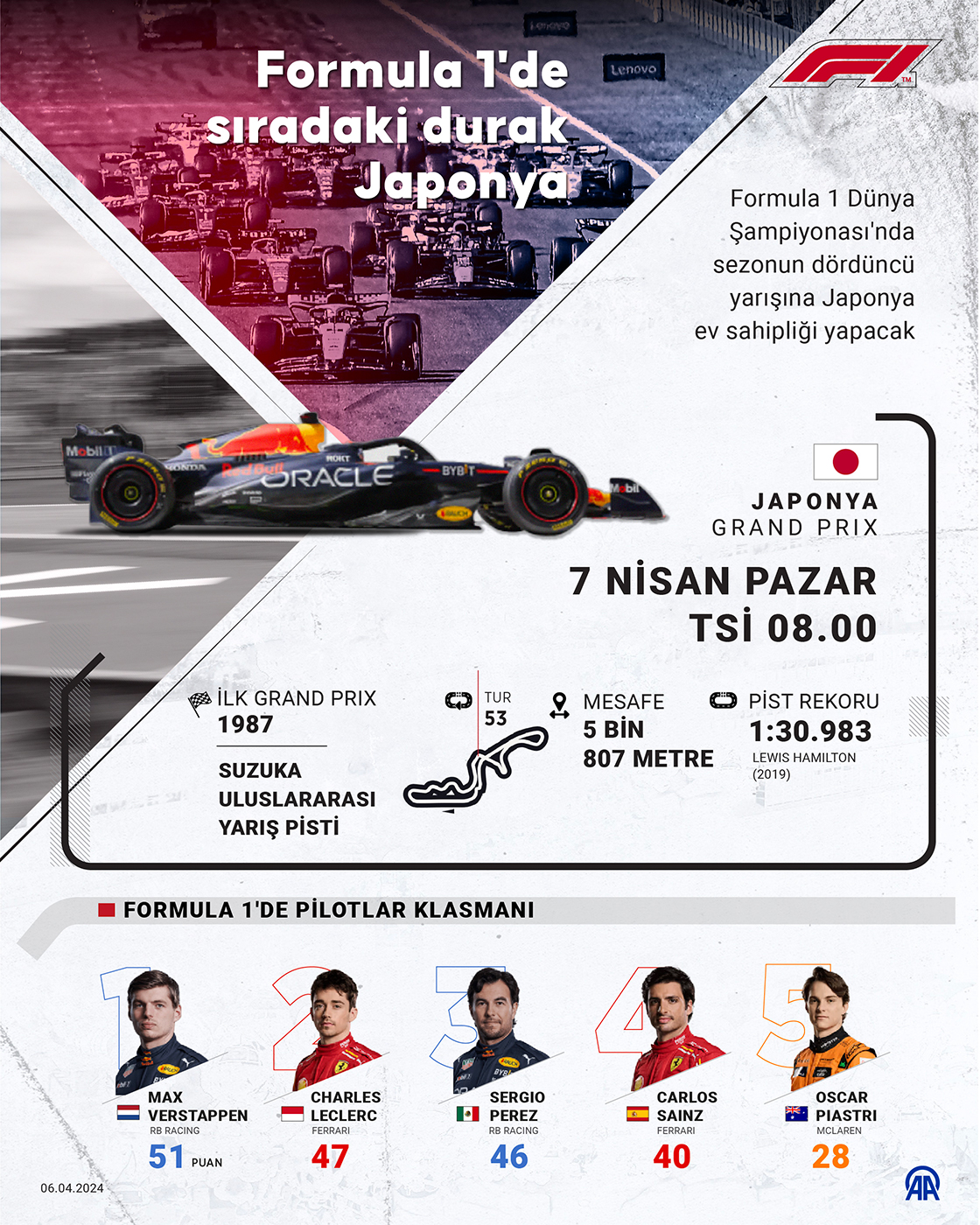 Suzuka'da yer alan 5,8 kilometre uzunluğundaki Suzuka Uluslararası Yarış Pisti'nde yapılacak yarış, 53 tur üzerinden düzenlenecek. Sıralama turları Cumartesi TSİ 09.00, yarış ise 7 Nisan Pazar günü TSİ 08.00'de başlayacak. (Grafik: Kemal Delikmen/AA)06 Nisan 2024•Güncelleme: 06 Nisan 2024
