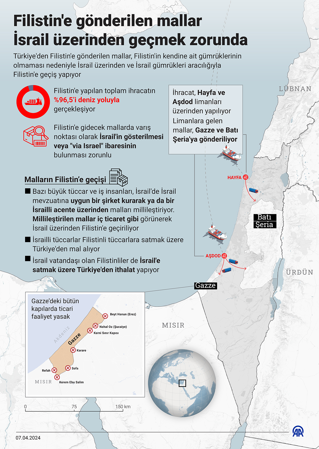 Türkiye'den Filistin'e gönderilen mallar, Filistin'in kendine ait gümrüklerinin olmaması nedeniyle İsrail üzerinden ve İsrail gümrükleri aracılığıyla Filistin'e geçiş yapıyor.