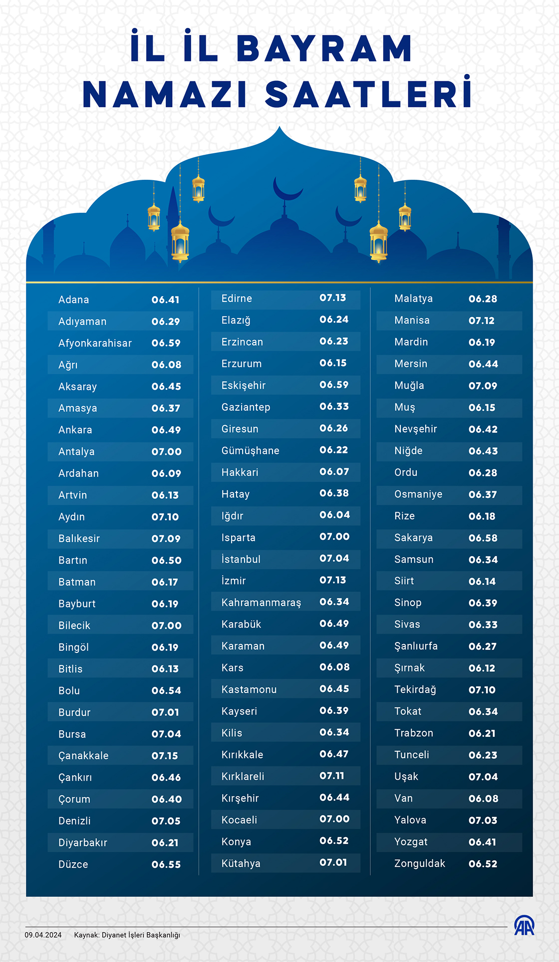 Ramazan Bayramı namazı Ankara'da 06.49, İstanbul'da 07.04, İzmir'de 07.13, Çanakkale'de 07.15, Iğdır'da 06.04'te kılınacak. (Grafik: Efnan İpşir/AA)