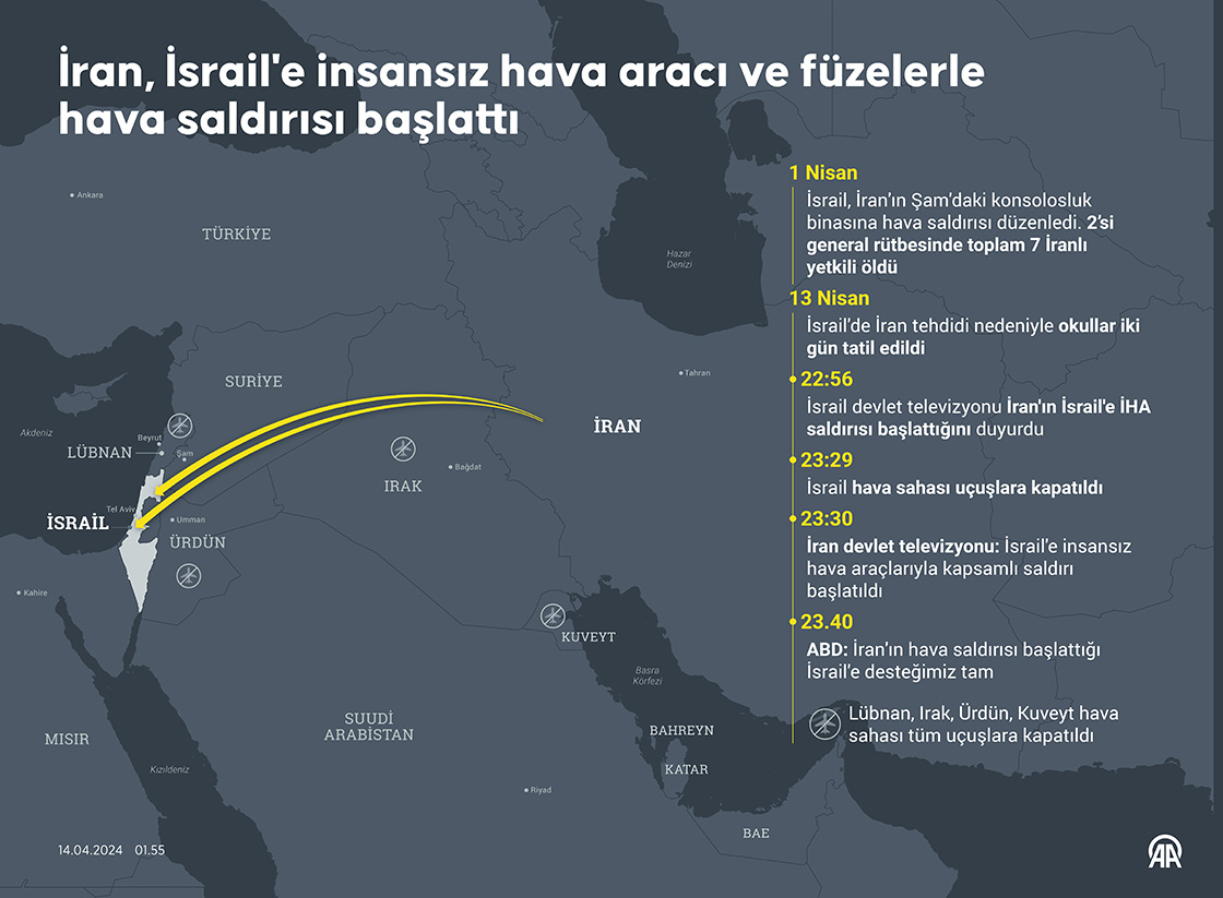 İran, İsrail'e insansız hava aracı ve füzelerle hava saldırısı başlattı. (Grafik: Elmurod Usubaliev/AA)