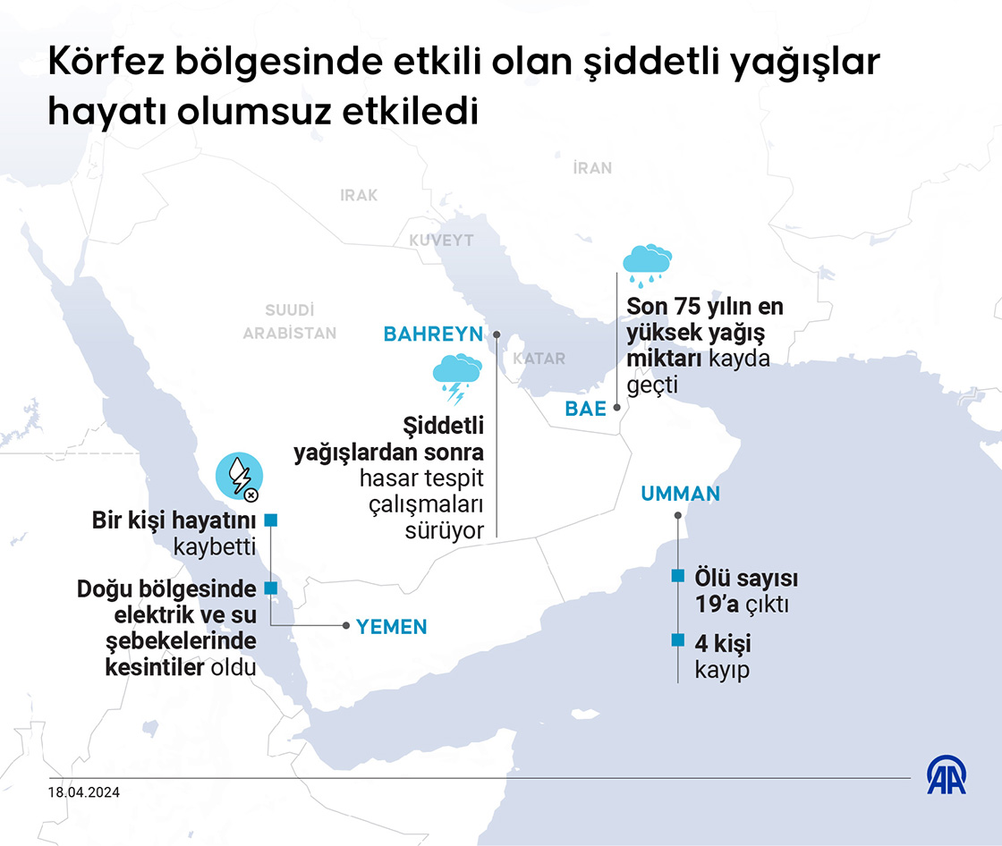 Körfez bölgesinde etkili olan şiddetli yağışlar birkaç ülkede hayatı olumsuz etkiledi