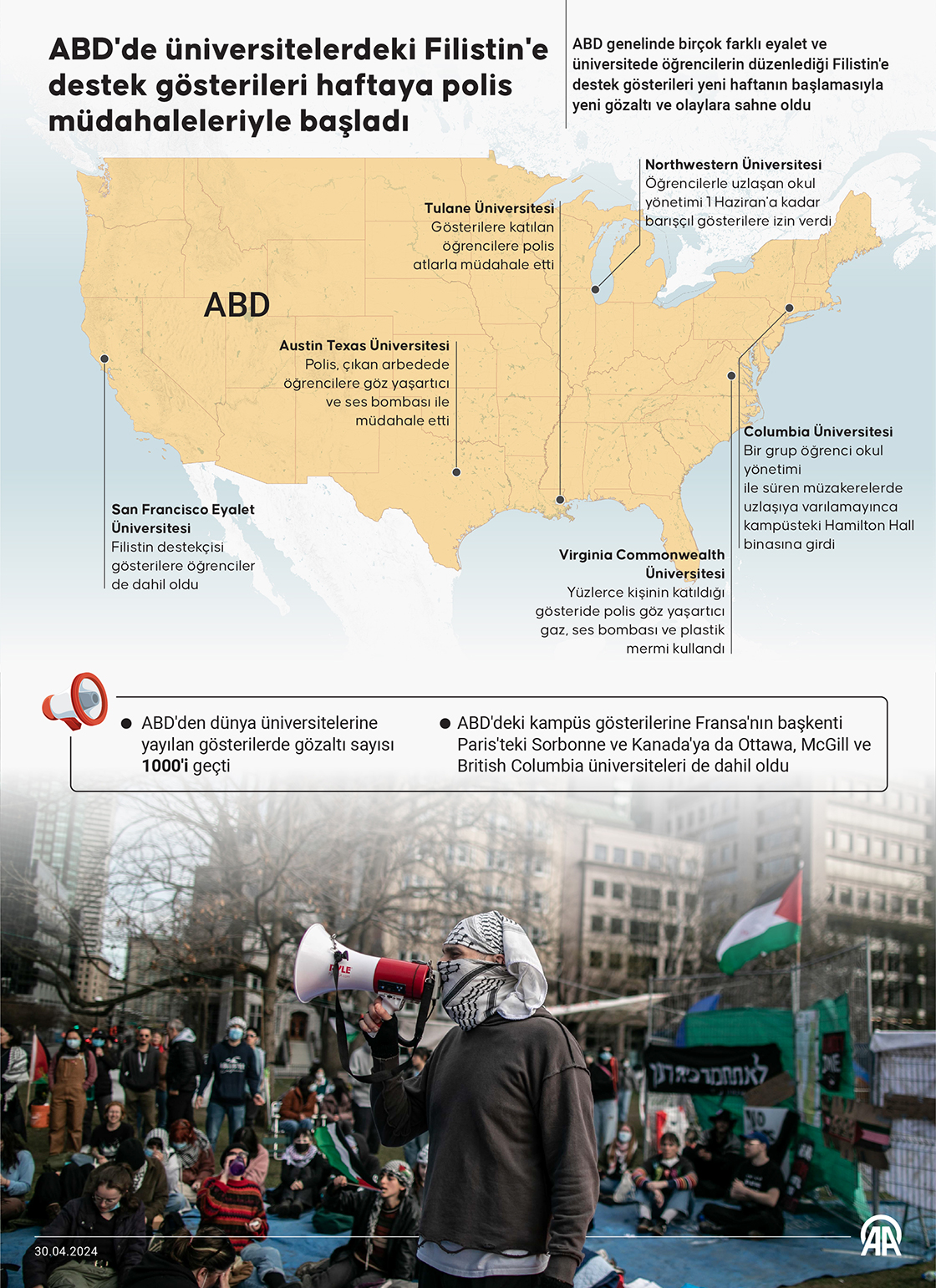 ABD genelinde birçok farklı eyalet ve üniversitede öğrencilerin düzenlediği Filistin'e destek gösterileri yeni haftanın başlamasıyla yeni gözaltı ve olaylara sahne oldu. (Grafik: Ufuk Celal Güzel/AA)