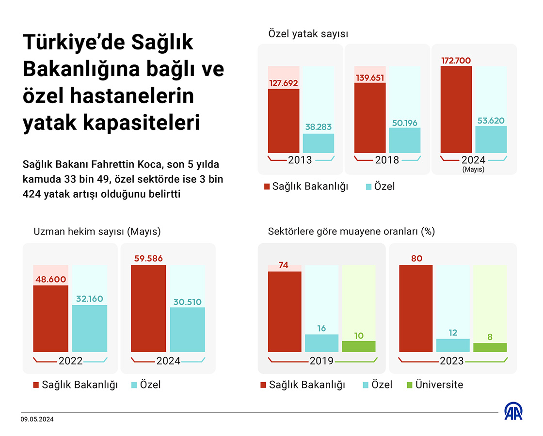 Sağlık Bakanı Fahrettin Koca, son 5 yılda kamuda 33 bin 49, özel sektörde ise 3 bin 424 yatak artışı olduğunu belirtti. (Grafik: Mehmet Yaren Bozğun/AA)