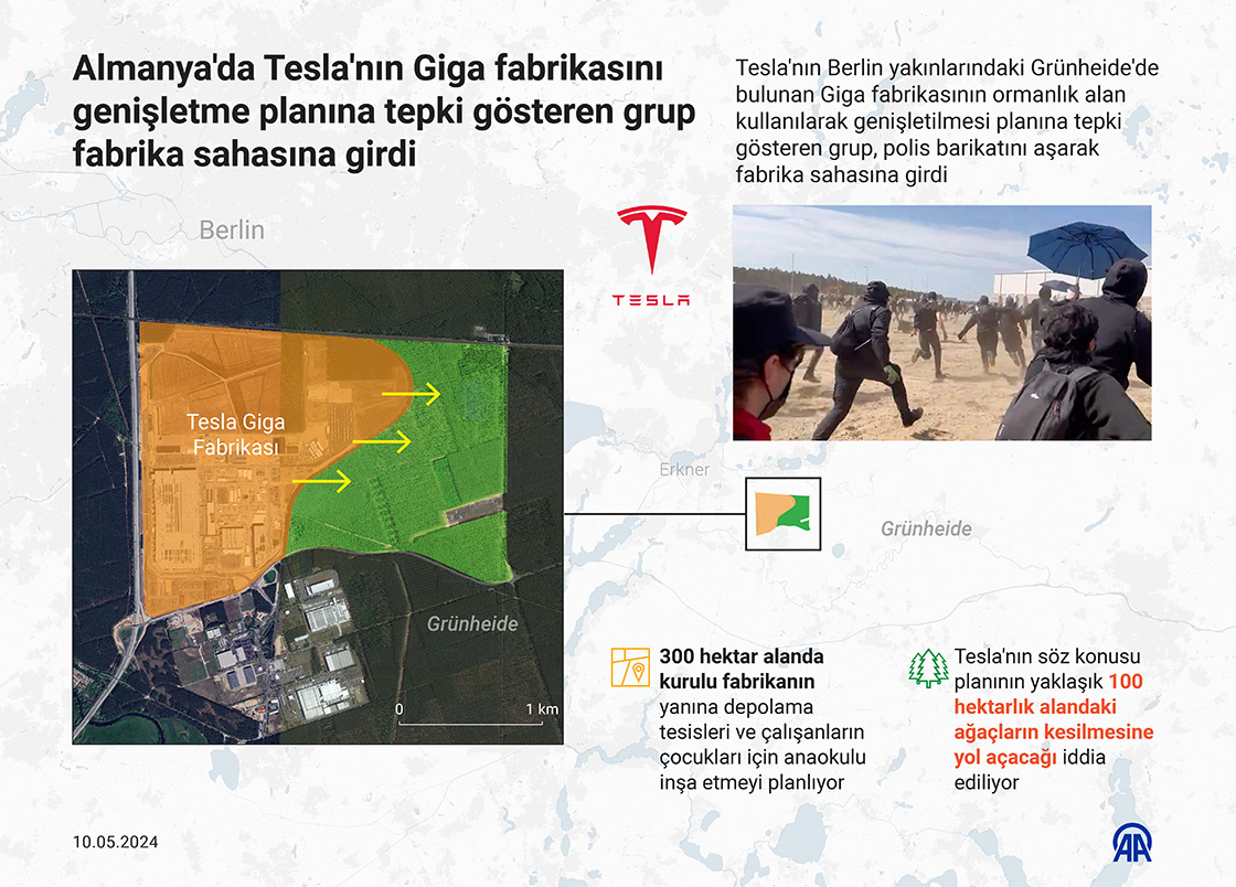 Tesla'nın Berlin yakınlarındaki Grünheide'de bulunan giga fabrikasının ormanlık alan kullanılarak genişletilmesi planına tepki gösteren grup, polis barikatını aşarak fabrika sahasına girdi. (Grafik: Elmurod Usubaliev/AA)10 Mayıs 2024•Güncelleme: 10 Mayıs 2024