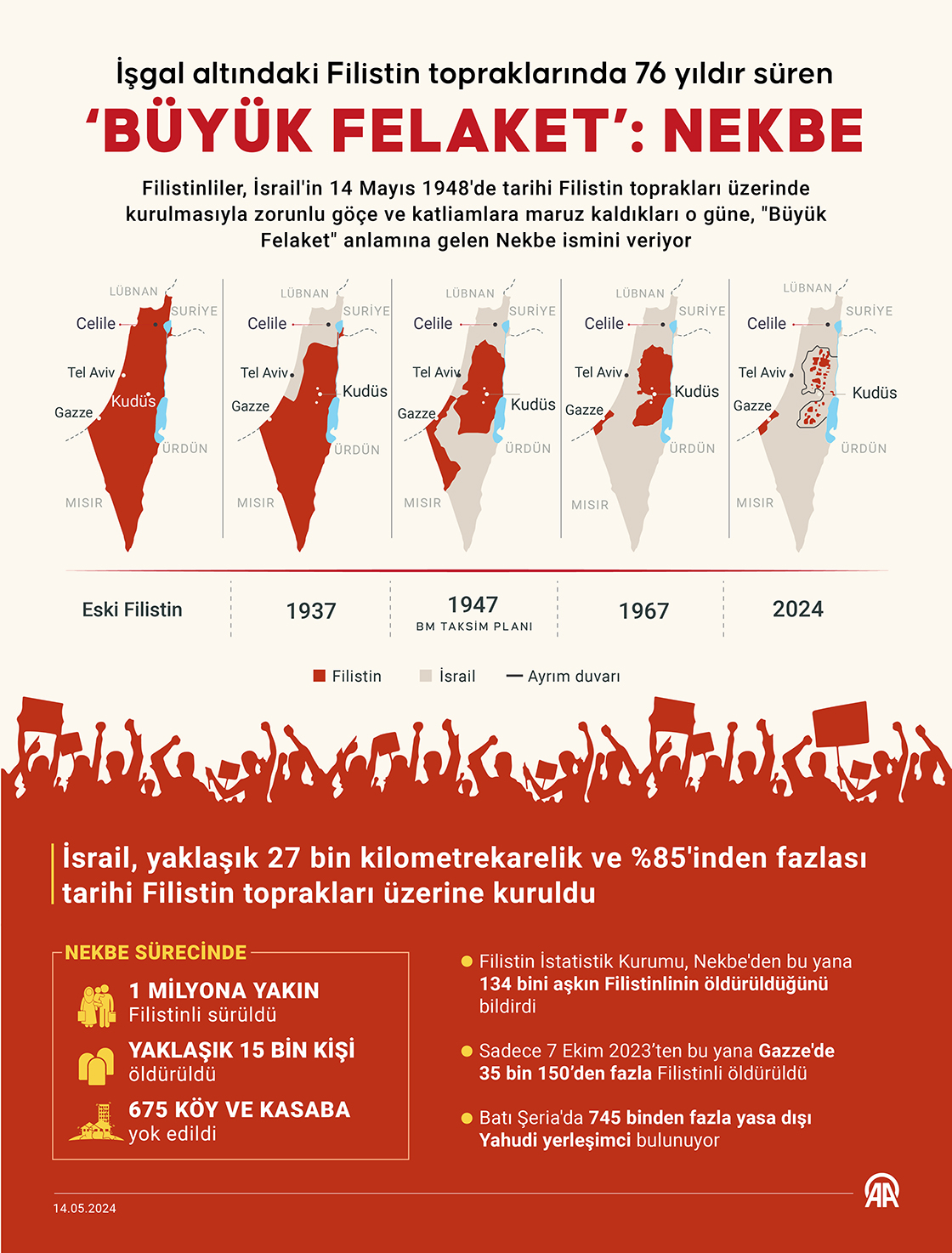 Filistinliler, İsrail'in 14 Mayıs 1948'de tarihi Filistin toprakları üzerinde kurulmasıyla zorunlu göçe ve katliamlara maruz kaldıkları o güne, 'Büyük Felaket' anlamına gelen Nekbe ismini veriyor. (Grafik: Elmurod Usubaliev/AA)14 Mayıs 2024•Güncelleme: 14 Mayıs 2024