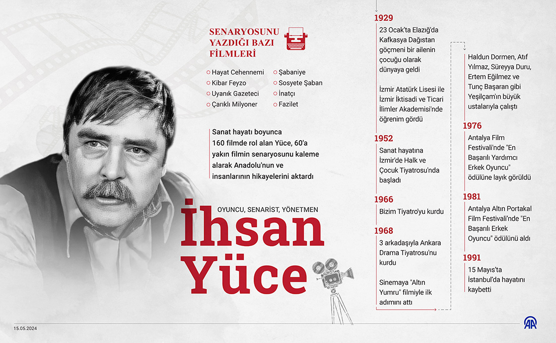 Sanat hayatı boyunca 160 filmde rol alan Yüce, 60'a yakın filmin senaryosunu kaleme alarak Anadolu'nun ve insanlarının hikayelerini aktardı. (Grafik: Muhammed Ali Yiğit/AA)