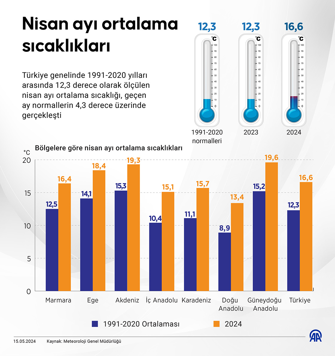 Türkiye genelinde 1991-2020 yılları arasında 12,3 derece olarak ölçülen nisan ayı ortalama sıcaklığı, geçen ay normallerin 4,3 derece üzerinde gerçekleşti. (Grafik: Mehmet Yaren Bozğun/AA)