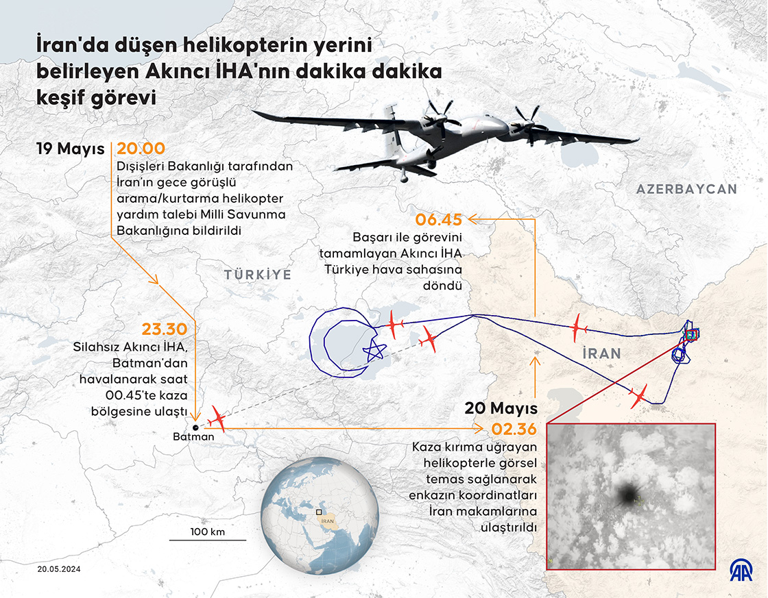 İran Cumhurbaşkanı İbrahim Reisi ve beraberindekilerin helikopterinin yerini belirleyen Akıncı İHA, Cumhurbaşkanlığından onay alınmasının ardından saat 23.30'da Batman'dan havalanarak saat 00.45'te kaza bölgesine ulaştı. Saat 02.36'da kaza kırıma uğrayan helikopterle görsel temas sağlandı ve başarıyla görevini tamamlayan Akıncı İHA saat 06.45'te Türkiye hava sahasına döndü. (Grafik: Yasin Demirci/AA)20 Mayıs 2024•Güncelleme: 20 Mayıs 2024