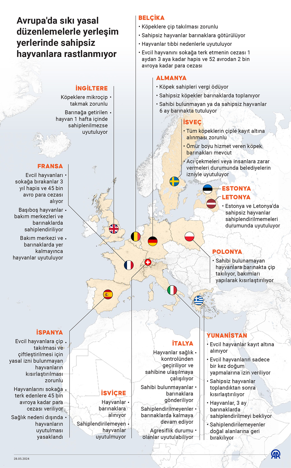 Avrupa'da yıllar içinde sahipsiz hayvanların toplanması, sahiplendirmesi ve uyutulması konularında uygulamaya konulan yasal düzenlemeler ve yeterli kapasiteye sahip barınaklar; sahipsiz hayvanların sokaklarda halka tehdit oluşturmaması ve popülasyonlarının kontrol altında tutulması için örnek teşkil ediyor. (Grafik: Yılmaz Yücel/AA)28 Mayıs 2024•Güncelleme: 28 Mayıs 2024