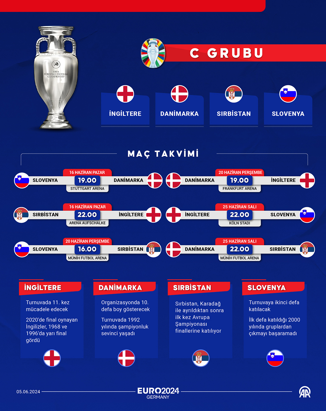 2024 Avrupa Futbol Şampiyonası'nda (EURO 2024) C Grubu'nda İngiltere, Danimarka, Sırbistan ve Slovenya yer alıyor. (Grafik: Kemal Delikmen/AA)
