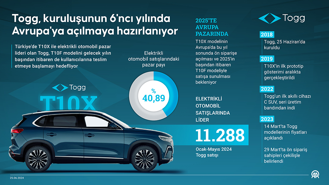 Türkiye'de T10X ile elektrikli otomobil pazar lideri olan Togg, T10F modelini gelecek yılın başından itibaren de kullanıcılarına teslim etmeye başlamayı hedefliyor. (Grafik: Muhammed Ali Yiğit/AA)