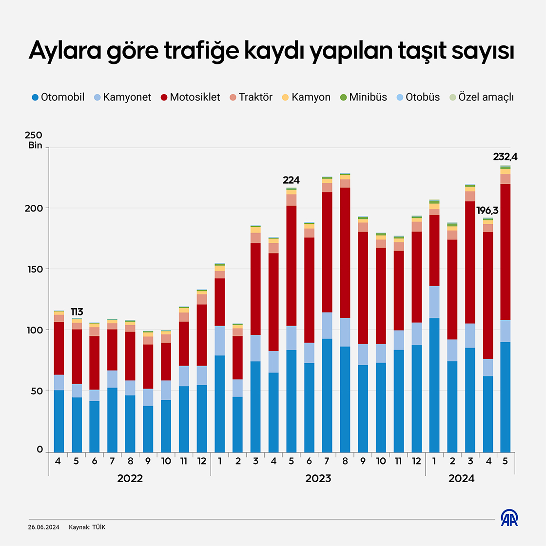 Trafiğe mayısta 232 bin 401 taşıtın kaydı yapıldı. (Grafik: Mehmet Yaren Bozğun/AA)