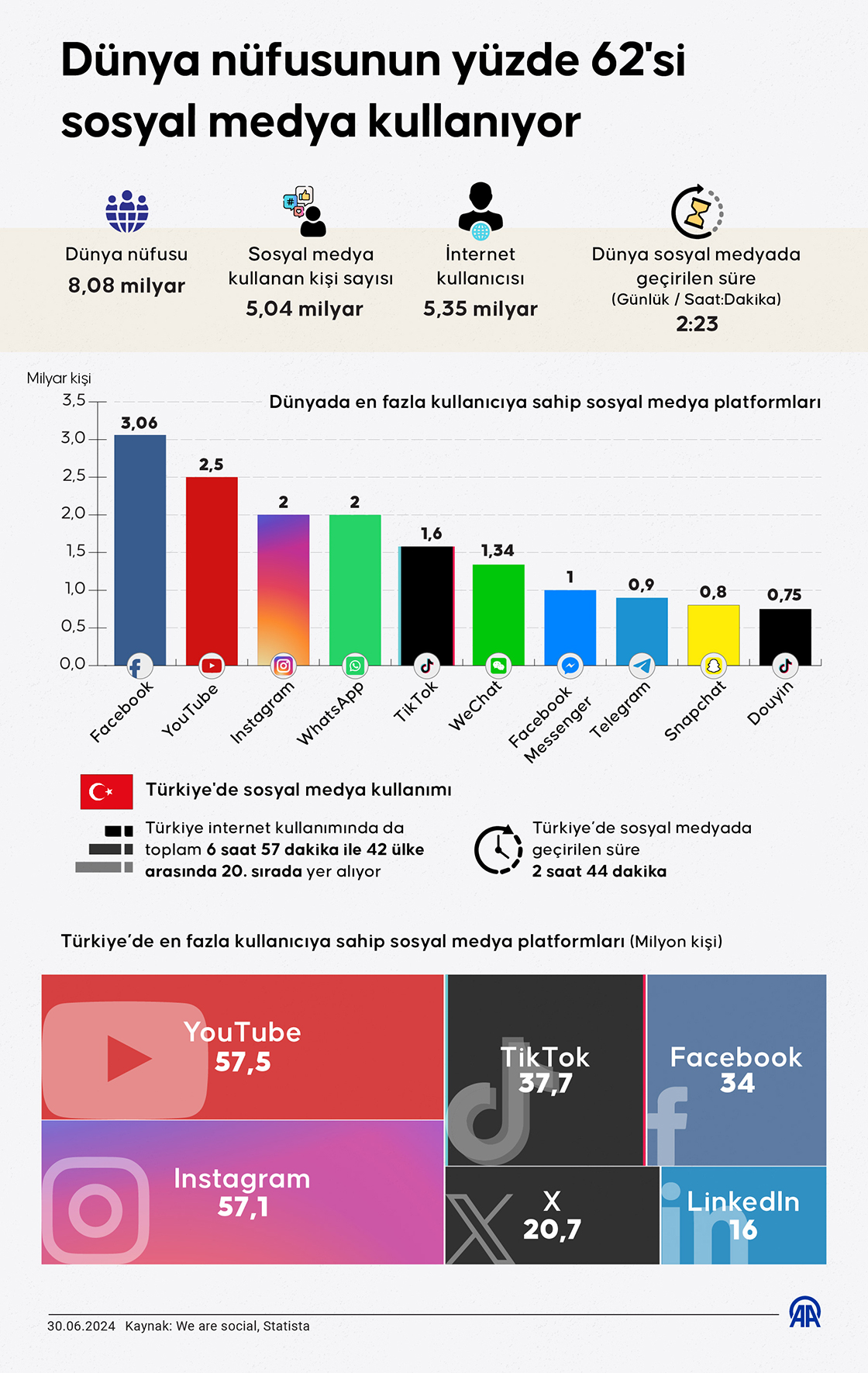 Dünyada kullanıcılarının sayısı her yıl artan sosyal medyayı 2024 verilerine göre toplam nüfusun yüzde 62'si kullanıyor. (Grafik: Ufuk Celal Güzel/AA)