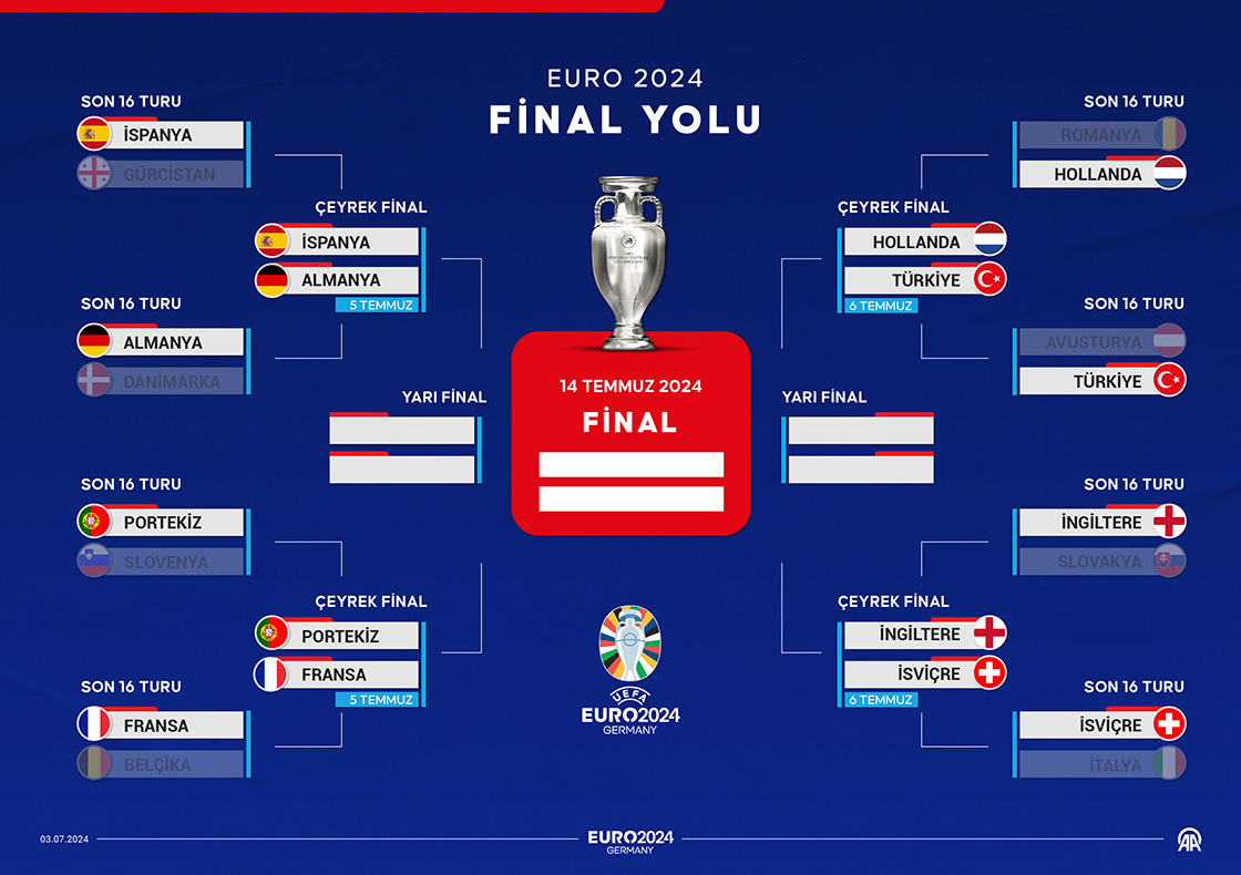 2024 Avrupa Futbol Şampiyonası'nda (EURO 2024) çeyrek final eşleşmeleri ve maç programı belli oldu. (Grafik: Kemal Delikmen/AA)